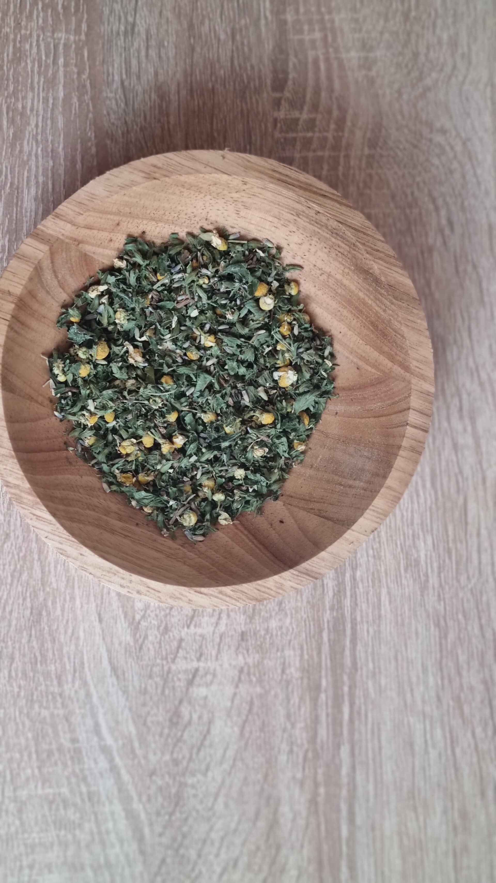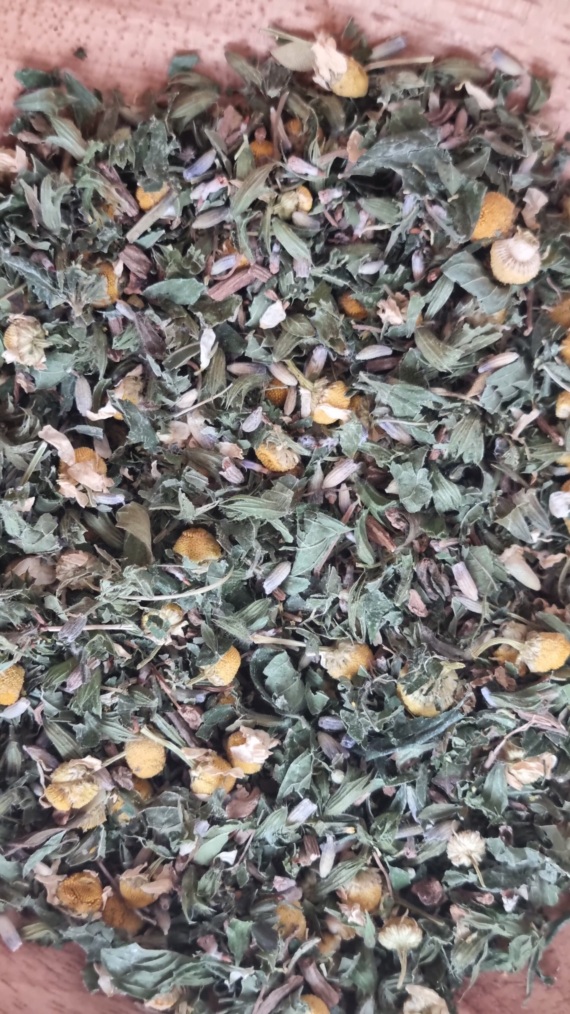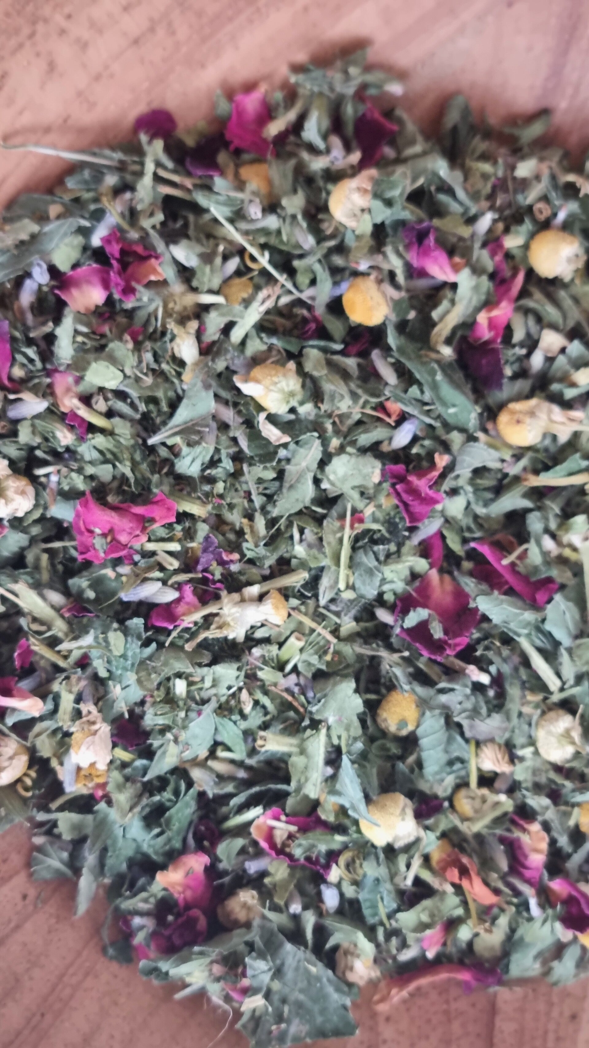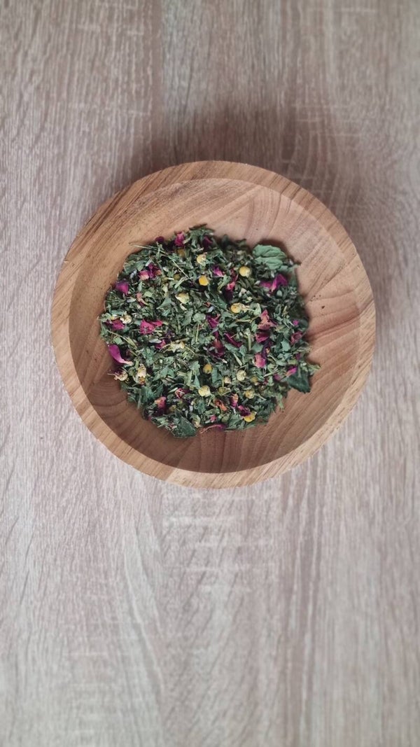 ​Ingrediënten: Citroenmelisse, Vrouwenmantel, Kamille, Passiekruid, Lavendel en Rozenblaadjes.